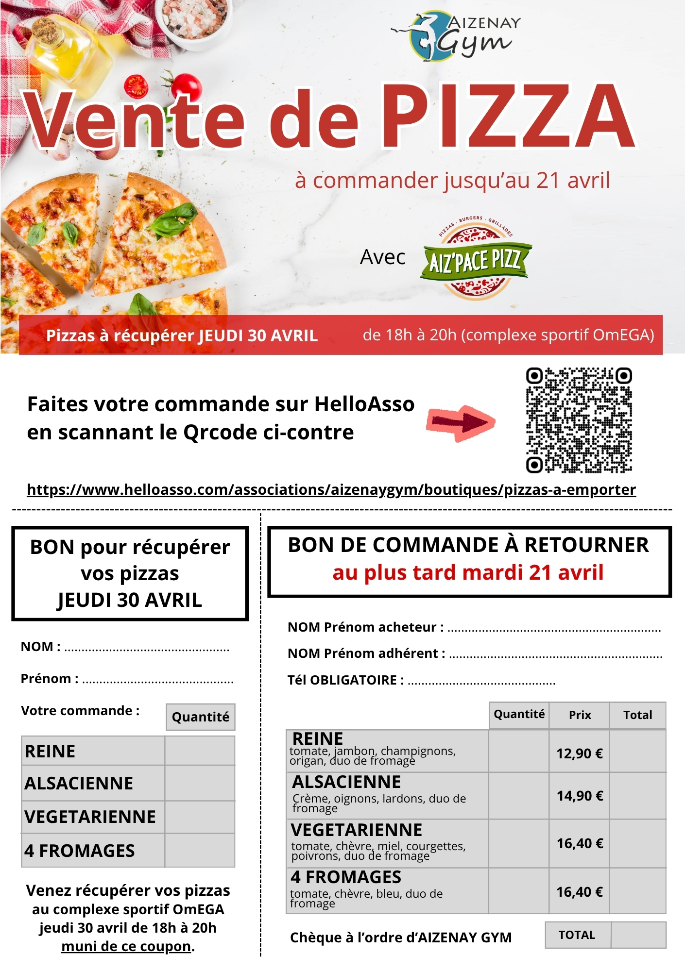 > Pour commander il suffit de cliquer sur ce lien HELLOASSO : https://www.helloasso.com/associations/aizenaygym/boutiques/pizzas-a-emporter ou de télécharger le bon de commande